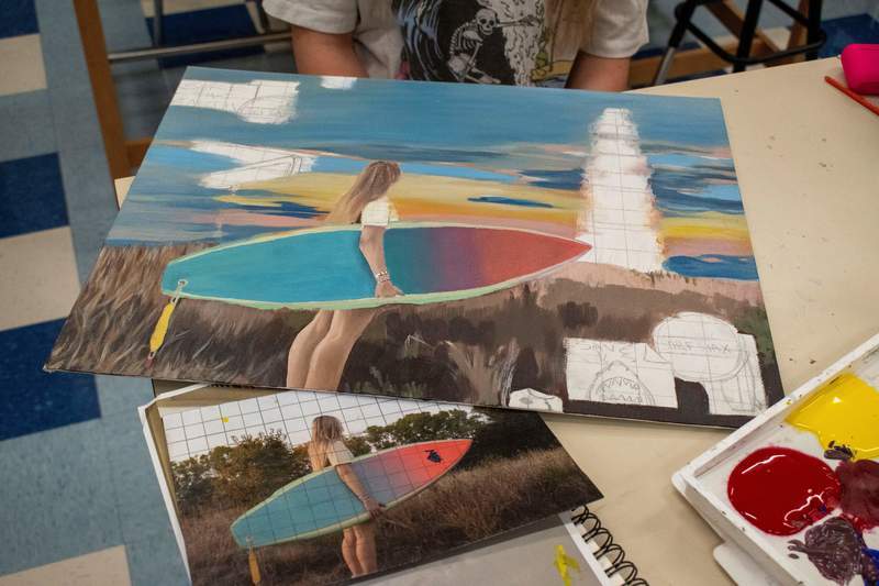 Davis recently finished a self-portrait piece that meshes reality and her own artistic vision, it shows her driving her own car - but as a fighter pilot. She expressed that this helps her show the freedom she feels while driving. Additionally, she’s currently working on a piece that shows her with her surfboard, but in the midst of a Kansas field. Davis expressed that this shows the contrast between two things she loves most - surfing, and the view of sprawling Kansas wheat fields in the sunlight.